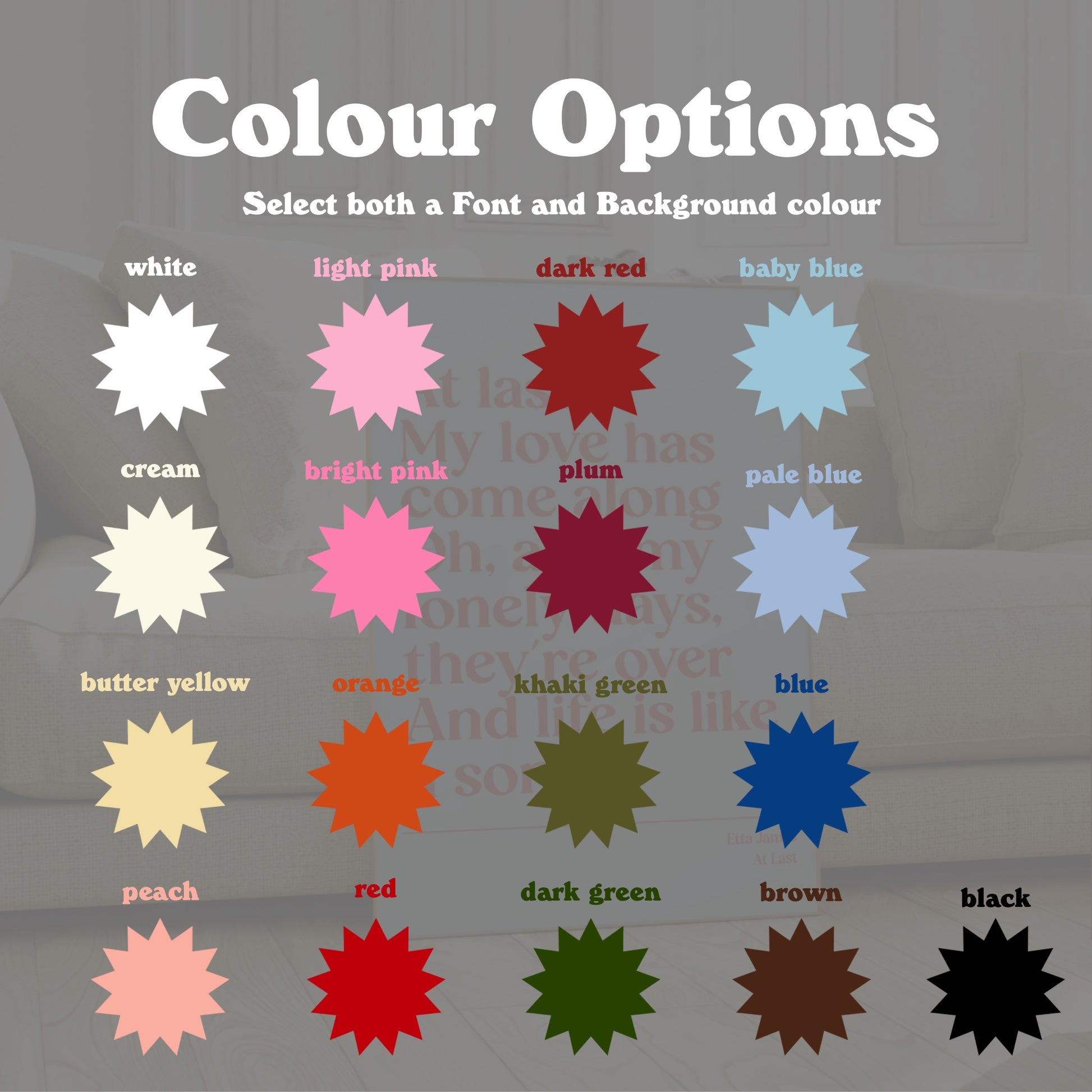 - Please pick both a background and a font colour from the list above. When entering your colour options please clearly state BACKGROUND and FONT before.